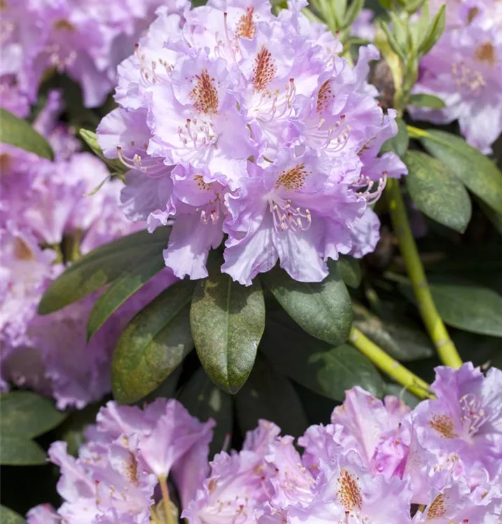 Die lilafarbenen, , trichterförmigen Blüten des Rhododendron 'Humboldt' erscheinen in Dolden von Ende Mai bis Mitte Juni.