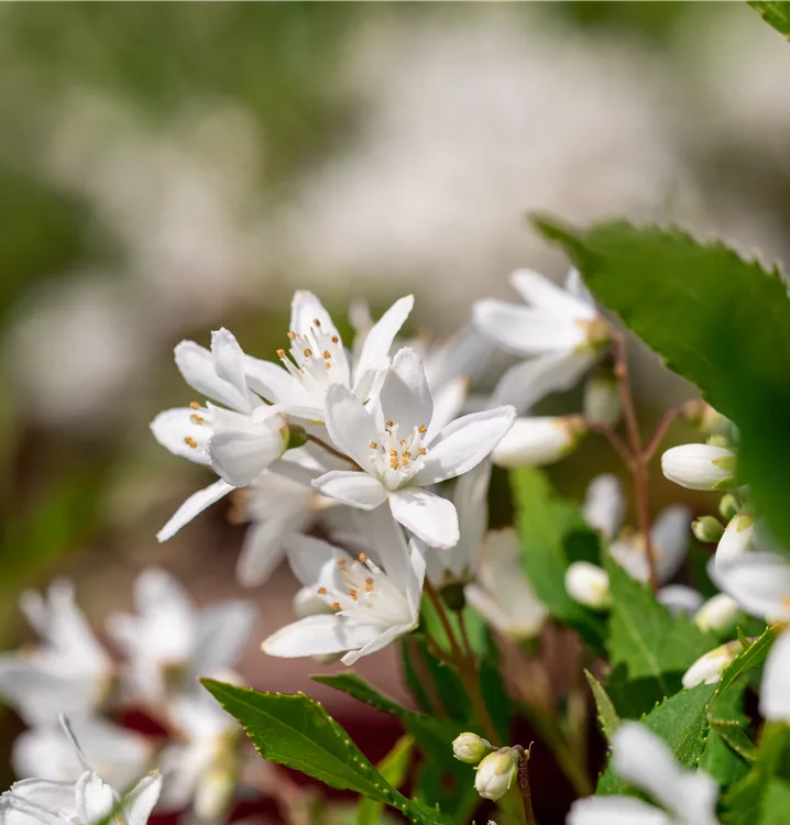 Die weissen, glockenförmigen Blüten der Deutzie 'Yuki Snowflake'® erscheinen in Rispen von Mai bis Juni. Diese sind angenehm duftend.