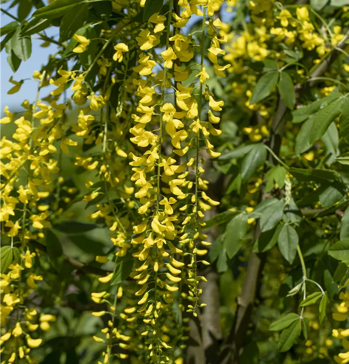 Der Edel-Goldregen 'Vossii' (Laburnum watereri) ist ein trichterförmiger Kleinbaum mit dekorativen Früchten. Diese verströmen einen angenehmen Duft. Diesen voraus bringt er von Mai bis Juni goldgelbe, schmetterlingsförmige, in Trauben angeordnete Blüten hervor. Zudem trägt der Edel-Goldregen 'Vossii', dreizählige, dunkelgrüne Blätter. An einem sonnigen bis halbschattigen, windgeschützten Standort mit durchlässigem, kalkhaltigem, nährstoffreichem Boden erreicht er gewöhnlich eine Höhe von ca. 6 m und wird ca. 4 m breit.