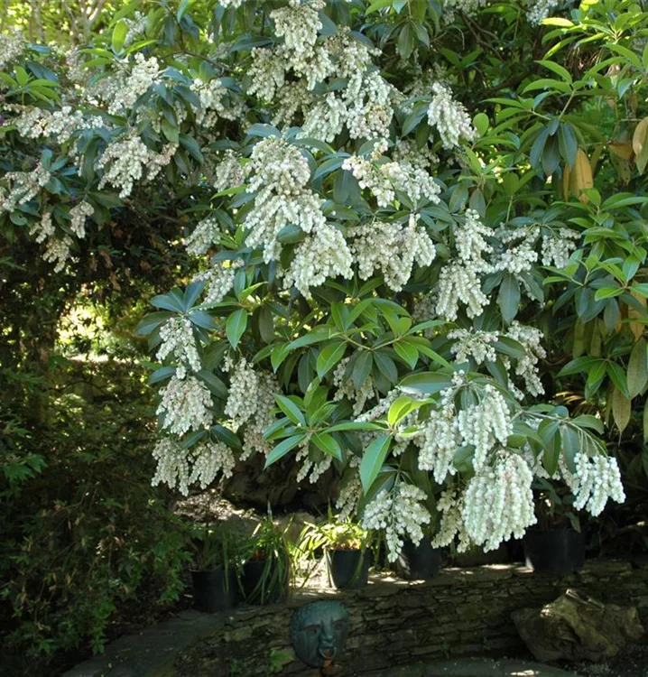 Das Japanische Schattenglöckchen (Pieris japonica) ist ein buschiger, breiter Strauch, der weisse, in Rispen angeordnete Blüten hervorbringt. Sie erscheinen von März bis Mai. Aus diesen gehen ab August hellbraune, runde Früchte hervor. Zudem trägt das Japanische Schattenglöckchen, glänzende, lanzettliche, dunkelgrüne Blätter. Seine Rinde ist rot-braun, streifenförmig eingerissen. An einem halbschattigen bis schattigen, windgeschützten Standort mit humosem, nährstoffreichem Boden erreicht es gewöhnlich eine Höhe von ca. 3 m und wird ca. 3 m breit.