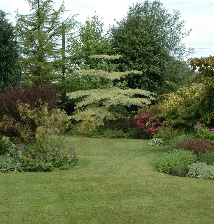 Der Hohe weissbunte Etagen-Hartriegel 'Variegata' (Cornus controversa) ist ein kegelförmiger Grossstrauch mit dekorativen, schwarz-blauen Früchten. Diesen voraus bringt er von Mai bis Juli cremeweisse, in Schirmtrauben angeordnete Blüten hervor. Zudem trägt der Hohe weissbunte Etagen-Hartriegel 'Variegata', eiförmige, dunkelgrüne Blätter mit einem weissen Rand. Der grüngelbe Austrieb ist ebenso ein interessanter Anblick. An einem sonnigen bis halbschattigen Standort mit durchlässigem, nährstoffreichem Boden erreicht er gewöhnlich eine Höhe von ca. 6 m und wird ca. 4 m breit.
