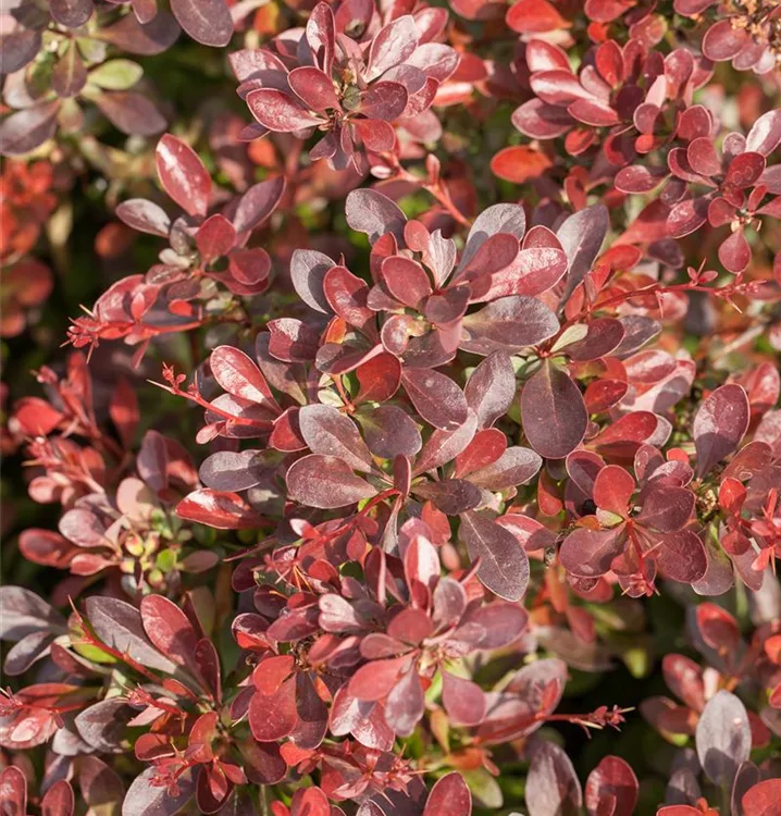 Die sommergrünen Blätter der Rote Zwergberberitze 'Bagatelle' sind purpurrot, eiförmig, wechselständig. Diese sind etwa 1 - 2 cm gross. Rote Zwergberberitze 'Bagatelle' zeigt sich leuchtend scharlachrot im Herbst.