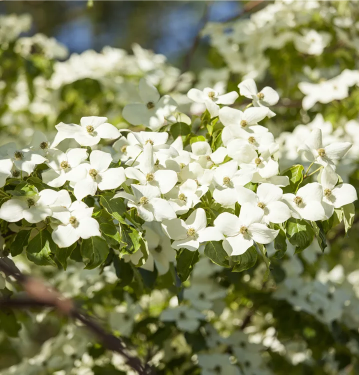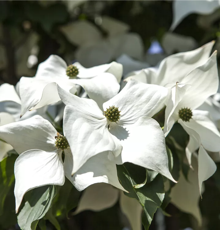 Die weissen Blüten des Chinesischen Blumen-Hartriegel erscheinen in Dolden von Ende Mai bis Juni. Diese werden etwa 8 - 10 cm gross.