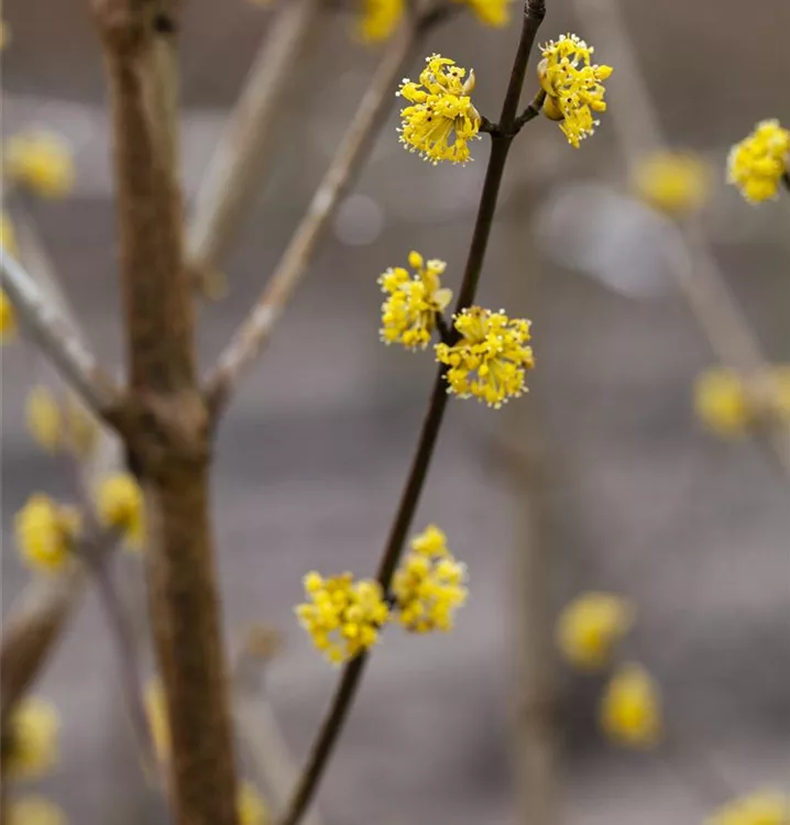Die goldgelben Blüten der Kornelkirsche erscheinen in Dolden von März bis April. Diese sind leicht duftend.
