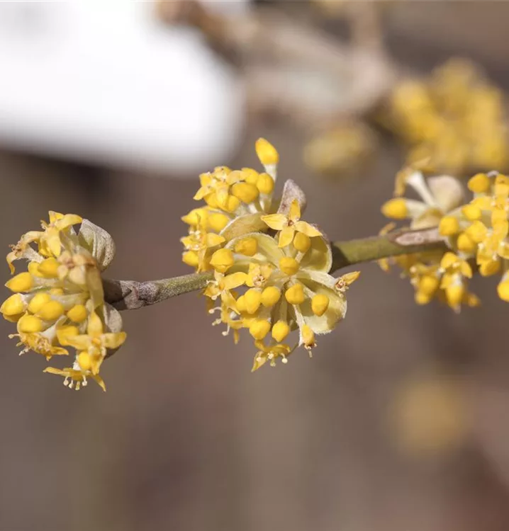 Die goldgelben Blüten der Kornelkirsche 'Jolico' erscheinen in Dolden von März bis April. Diese sind leicht duftend.