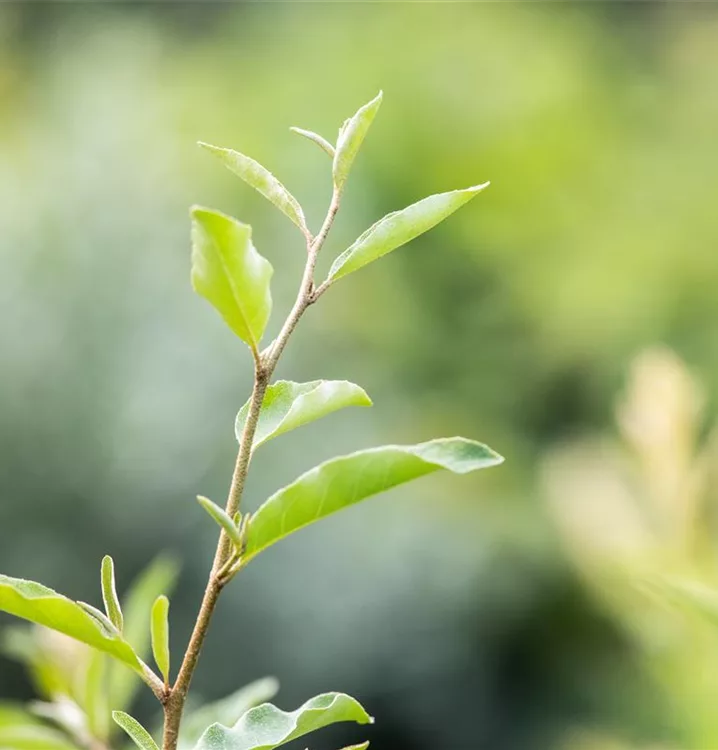 Die sommergrünen Blätter der Essbare Ölweide sind dunkelgrün, eiförmig, wechselständig. Diese sind etwa 6 - 8 cm gross.