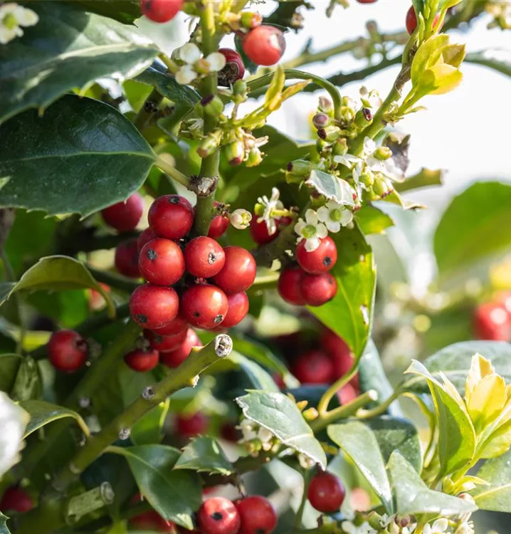 Besonders dekorativ sind die roten Steinfrüchte von Ilex aquifolium. Diese erscheinen ab Oktober.Haften sehr lange.