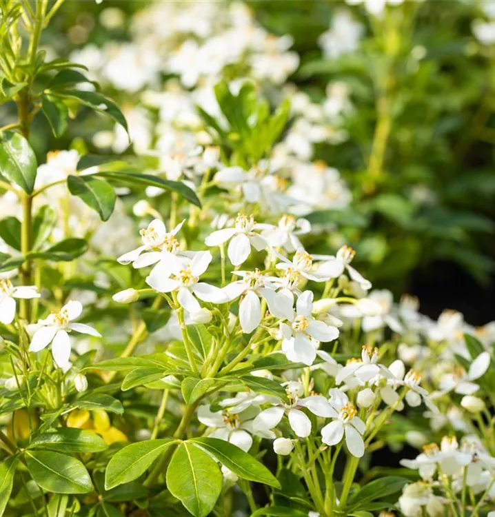 Die Orangenblume (Choisya ternata) ist eine sehr beliebte, immergrüne Kübelpflanze, deren grünbraunen Früchte bei guter Pflege möglich sind. Ihre dekorativen Blüten sind sternförmig und erscheinen von März bis Oktober. Sie verströmen einen starken Duft. Die hellgrünen Blätter sind gefingert und glänzend. Der Standort sollte möglichst sonnig bis schattig sein. Eine durchlässige, humose und nährstoffreiche Erde ist dabei ideal. Bei günstigen Bedingungen erreicht die Orangenblume eine Höhe von ca. 2,5 m und wird bis zu 2,5 m breit.