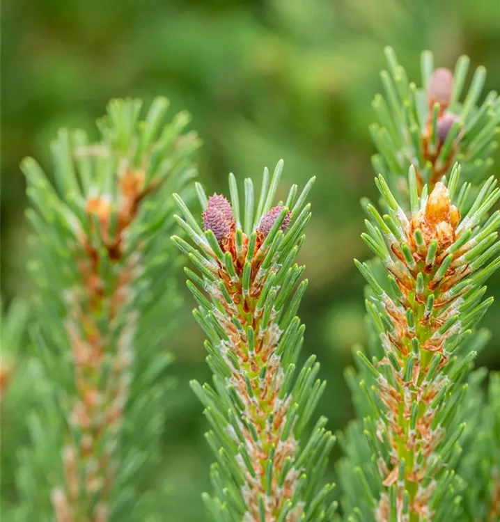 Die kegelförmigen, braun-gelben Zapfen von Pinus mugo 'Columnaris' erscheinen ab Oktober. Die jungen Zapfen haben eine rosarote Färbung.