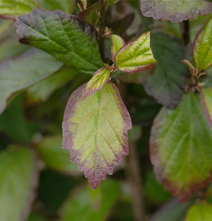 Die sommergrünen Blätter des Eisenbaums 'Persian Spire'(s) sind dunkelgrün, lanzettlich und weisen einen lilafarbenen Rand auf. Diese sind etwa 8 - 10 cm gross. Lilafarbener Austrieb. Eisenbaum 'Persian Spire'(s) zeigt sich leuchtend orange-gelb im Herbst.