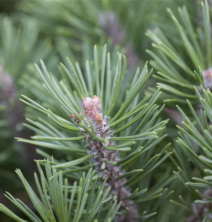 Die kegelförmigen, braun-gelben Zapfen von Pinus mugo 'Mops' erscheinen ab Oktober. Die jungen Zapfen haben eine rosarote Färbung.