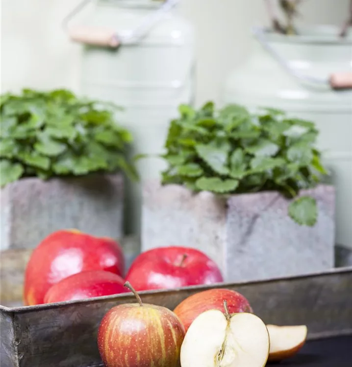 Der Herbstapfel 'Rubinette'® (Malus domestica) bildet orange-rote, kleine, mittelfeste und saftige Früchte. Sie sind rund und haben einen süss-säuerlichen Geschmack. Für eine ertragreiche Ernte ab Anfang Oktober schaffen durchlässiger, nährstoffreicher Boden und ein sonniger bis halbschattiger Standort optimale Bedingungen. Seine hellrosafarbenen Blüten sind eine schöne Erscheinung. Der Herbstapfel 'Rubinette'® wird mit seinem aufrechten und breiten Wuchs etwa 4 m hoch und 3 m breit.