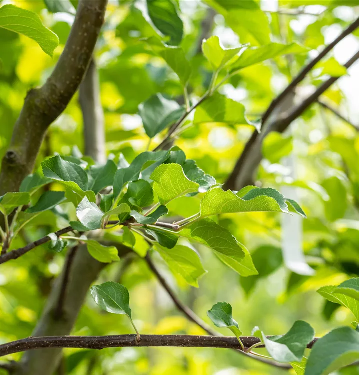 Die sommergrünen Blätter des Herbstapfels 'Rubinola'(s) sind mittelgrün, eiförmig, gesägt.