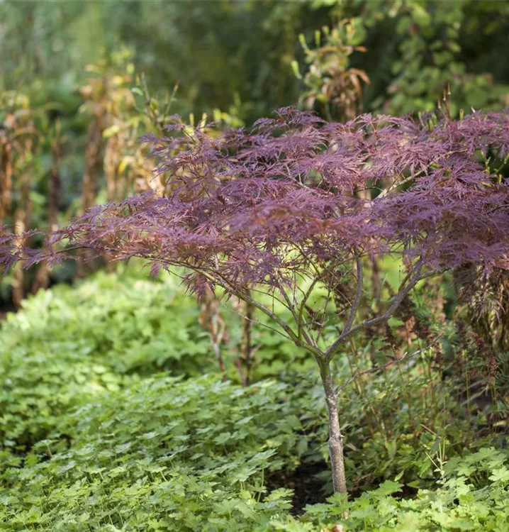 Der Fächerahorn 'Inaba-shidare' (Acer palmatum) ist ein gedrungener, überhängender, sommergrüner Strauch mit dekorativen, tief geschlitzten, dunkelroten Blättern. Zudem trägt er im Mai purpurrote, in Trauben angeordnete Blüten. Aus diesen gehen rote Flügelfrüchte hervor. An einem sonnigen bis halbschattigen, windgeschützten Standort mit durchlässigem, humosem Boden erreicht er gewöhnlich eine Höhe von ca. 2,5 m und wird ca. 3 m breit.