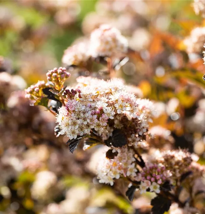 Die Fasanenspiere 'Little Devil'® (Physocarpus opulifolius) ist ein buschiger, aufrechter, kompakter, sommergrüner Grossstrauch oder Kleinstrauch mit dekorativen, eiförmigen, grün-roten Blättern. Der blutrote Austrieb ist ebenso ein interessanter Anblick. Zudem trägt sie von Juni bis Juli cremeweisse, in Doldentrauben angeordnete Blüten. An einem sonnigen bis halbschattigen Standort mit durchlässigem Boden erreicht sie gewöhnlich eine Höhe von ca. 1 m und wird ca. 1 m breit.