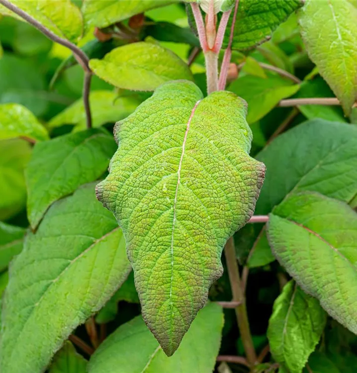 Die sommergrünen Blätter der Fellhortensie 'Macrophylla' sind dunkelgrün, lanzettlich, behaart, gegenständig. Diese sind etwa 20 - 35 cm gross.