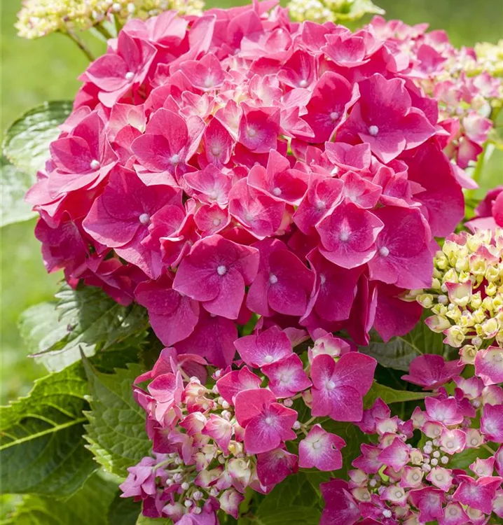 Die karminroten, schalenförmigen Blüten der Bauernhortensie 'Alpenglühen' erscheinen in Dolden von Juni bis September. Diese werden etwa 21 - 23 cm gross.