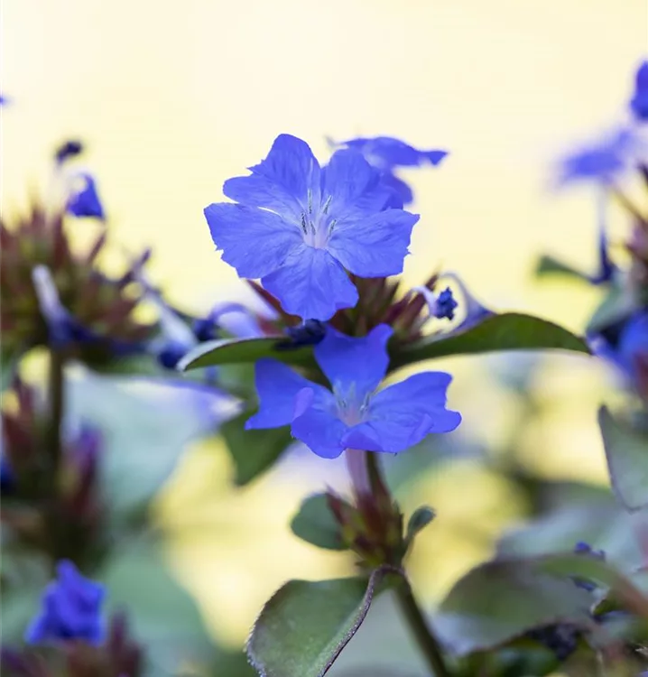 Ceratostigma plumbaginoides bildet radförmige, blaue Blüten ab August.