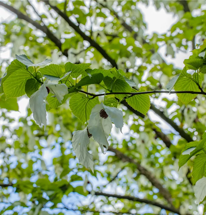 Der Taubenbaum (Davidia involucrata vilmoriniana) ist ein breiter, pyramidaler, sommergrüner Kleinbaum mit dekorativen, eiförmigen, mittelgrünen Blättern. Zudem trägt er von Mai bis Juni cremeweisse Blüten. Aus diesen gehen grüne Früchte hervor. An einem sonnigen bis halbschattigen, windgeschützten Standort mit durchlässigem, nährstoffreichem, lehmigem Boden erreicht er gewöhnlich eine Höhe von ca. 15 m und wird ca. 8 m breit.