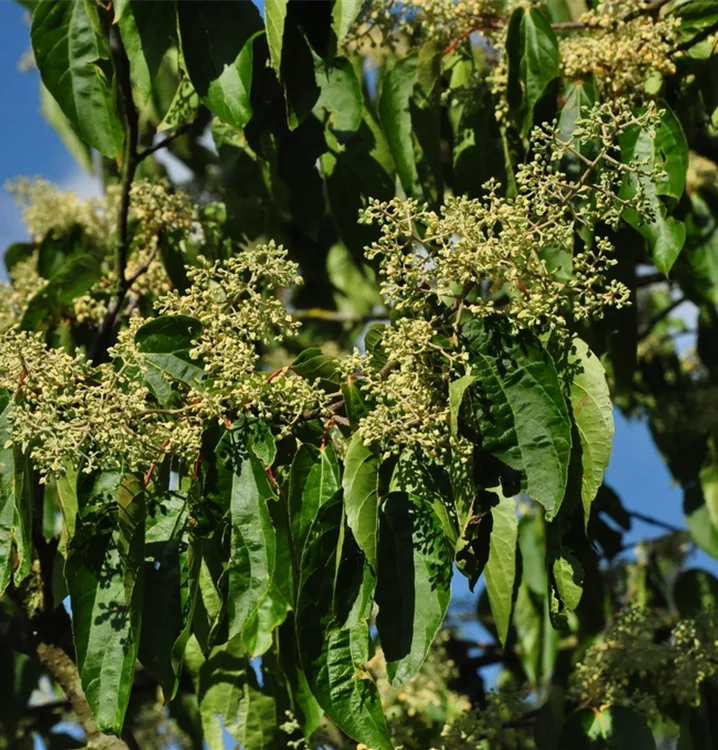 Die sommergrünen Blätter des Poliothyrsises sind mittelgrün, breit lanzettlich, wechselständig. Diese sind etwa 8 - 10 cm gross.