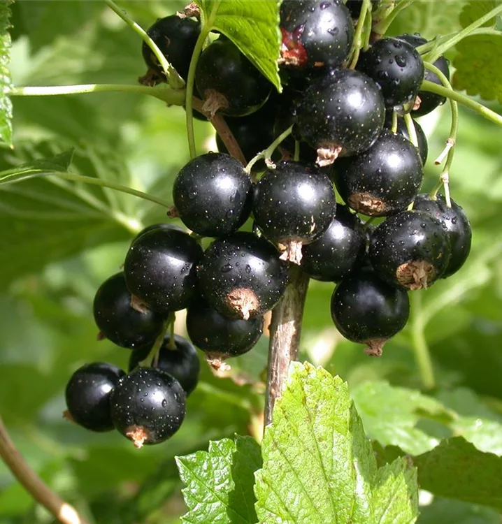 Die Johannisbeere 'Titania'(s) (Ribes nigrum) bildet schwarze, grosse Beeren. Diese sind süss-säuerlich im Geschmack. Für eine ertragreiche Ernte ab Juli schaffen durchlässiger, nährstoffreicher Boden und ein sonniger bis halbschattiger Standort optimale Bedingungen. Ihre grünen Blüten sind eine schöne Erscheinung.