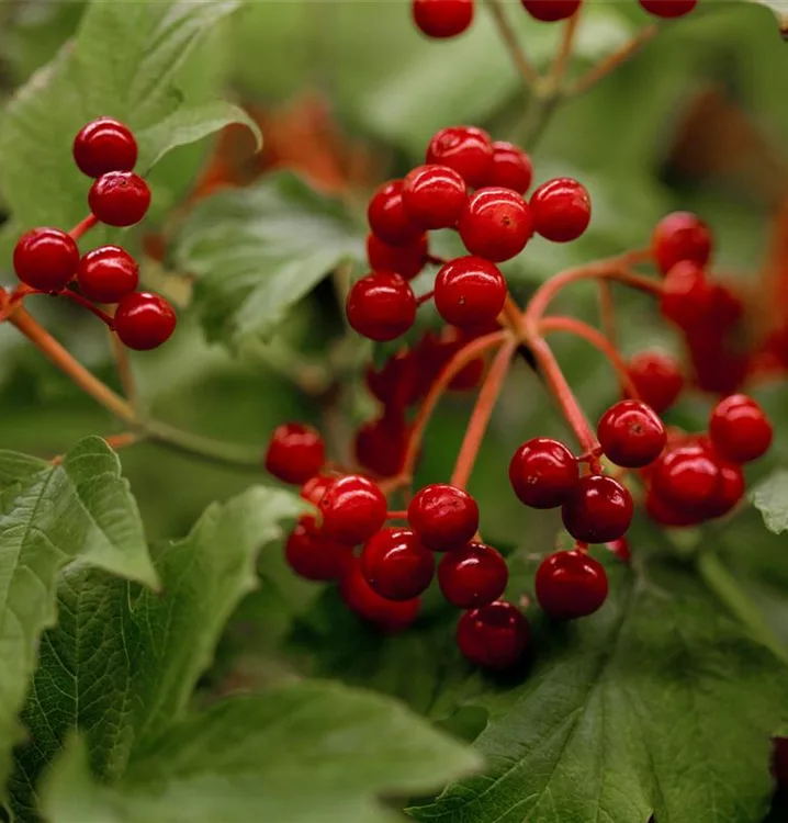 Besonders dekorativ sind die hellroten Steinfrüchte von Viburnum opulus 'Compactum'. Diese erscheinen ab September.Haften sehr lange.