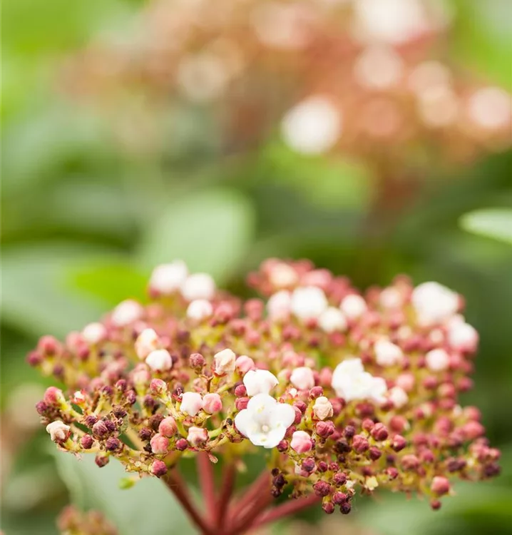 Die hellrosa-weissen Blüten des Lorbeer-Schneeball erscheinen in Schirmtrauben von März bis April. Diese sind leicht duftend. Bei richtiger Pflege Nachblüte im November.