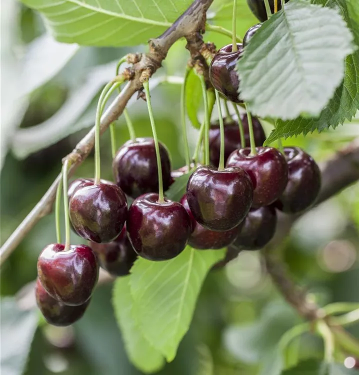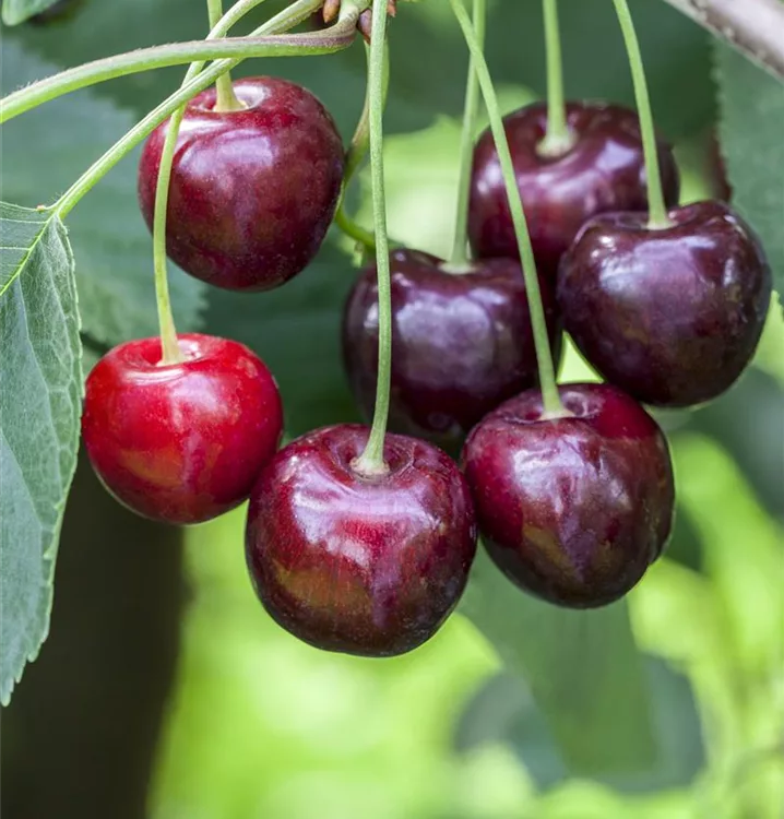 Prunus avium 'Regina' bildet dunkelrote Früchte.