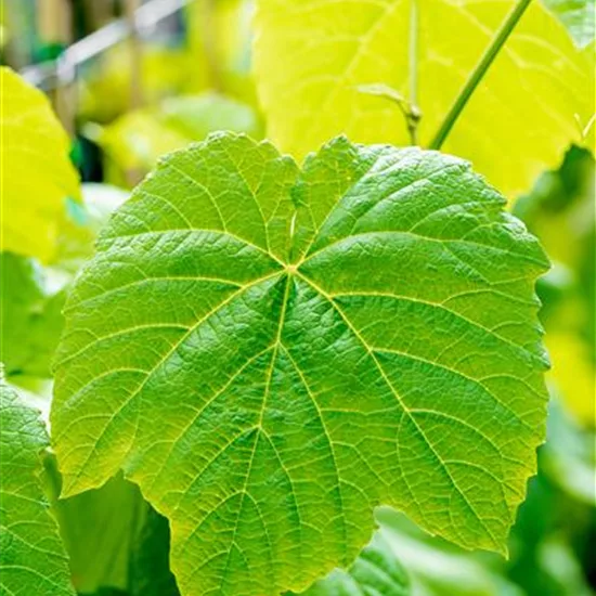 Die sommergrünen Blätter der Tafeltraube 'Vanessa'® sind dunkelgrün, herzförmig, gezähnt. Tafeltraube 'Vanessa'® zeigt sich leuchtend kupfergelb bis rot im Herbst.