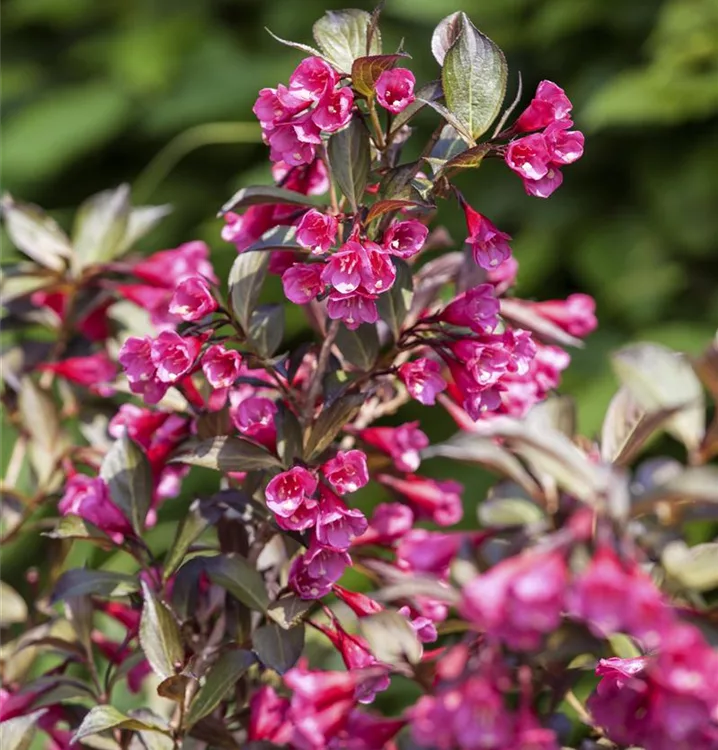 Die Rosa Weigelie 'Alexandra'(s) (Weigela florida) ist ein buschiger, aufrechter, dichter, sommergrüner Kleinstrauch mit dekorativen, eiförmigen, purpurroten Blättern. Zudem trägt sie von Mai bis Juni dunkelrosafarbene, trichterförmige Blüten. An einem sonnigen bis halbschattigen Standort mit durchlässigem, nährstoffreichem Boden erreicht sie gewöhnlich eine Höhe von ca. 1,3 m und wird ca. 90 cm breit.