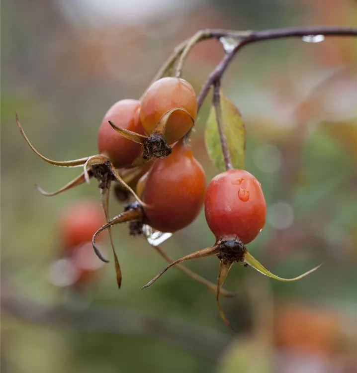 Besonders dekorativ sind die roten, runden Früchte von Rosa glauca. Diese erscheinen ab September.