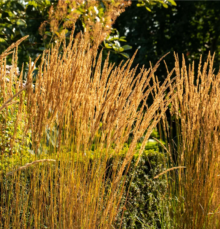 Das Garten-Reitgras 'Karl Foerster' (Calamagrostis x acutiflora) ist mit seiner mittelgrünen Blattfärbung ein dekoratives Gestaltungselement im Garten, welches ebenso mit seinem aufrechten Wuchs hervorsticht. Die braunen Blütenrispen schmücken diese Gras ab Sommer. An einem sonnigen Standort mit einem möglichst durchlässigen, lockeren, nährstoffreichen, sandigen Boden fühlt es sich am wohlsten. Bei günstigen Bedingungen erreicht dieses winterharte Gras eine Höhe von ca. 1,5 m und wird bis zu 1 m breit.