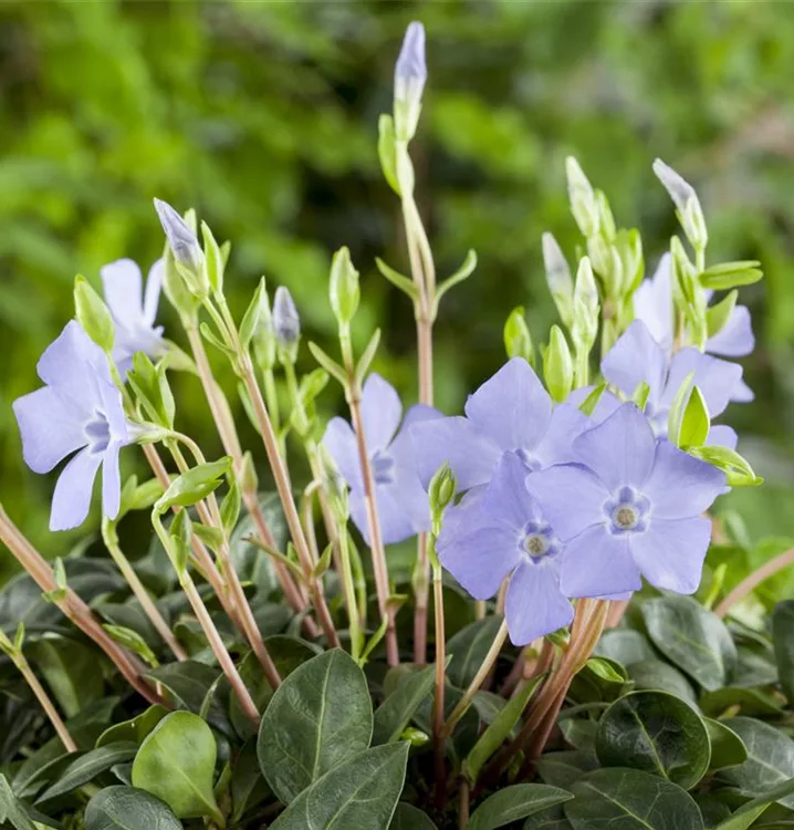 Das Kleinblättrige Immergrün (Vinca minor) ist eine kriechende, teppichartige, immergrüne Staude mit dekorativen, glänzenden, ledrigen, lanzettlichen, dunkelgrünen Blättern. Von Mai bis Juni trägt es blaue, radförmige Blüten. Wiederholte Blüte kommt bei richtiger Pflege im September vor. An einem sonnigen bis schattigen Standort mit durchlässigem, humosem, lockerem Boden erreicht es gewöhnlich eine Höhe von ca. 30 cm und wird ca. 50 cm breit. Das Kleinblättrige Immergrün ist gut frostverträglich.