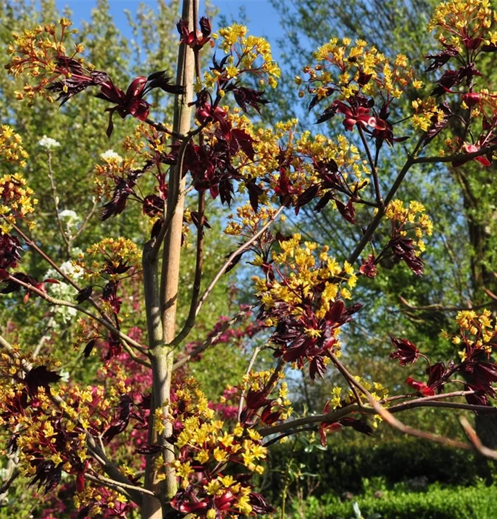 Die grüngelben Blüten des Roten Spitzahorn 'Crimson King' erscheinen in Doldentrauben im April.