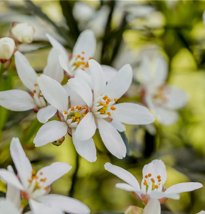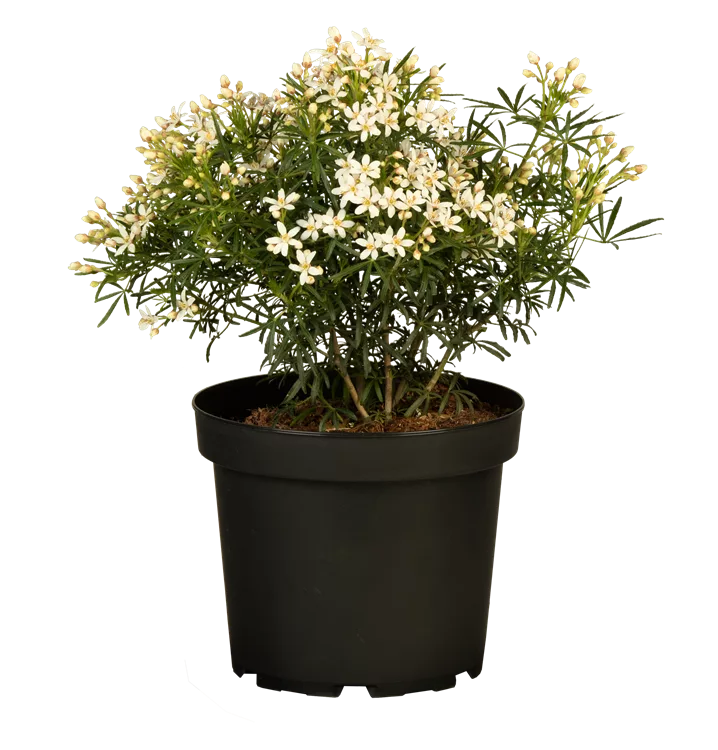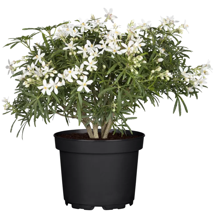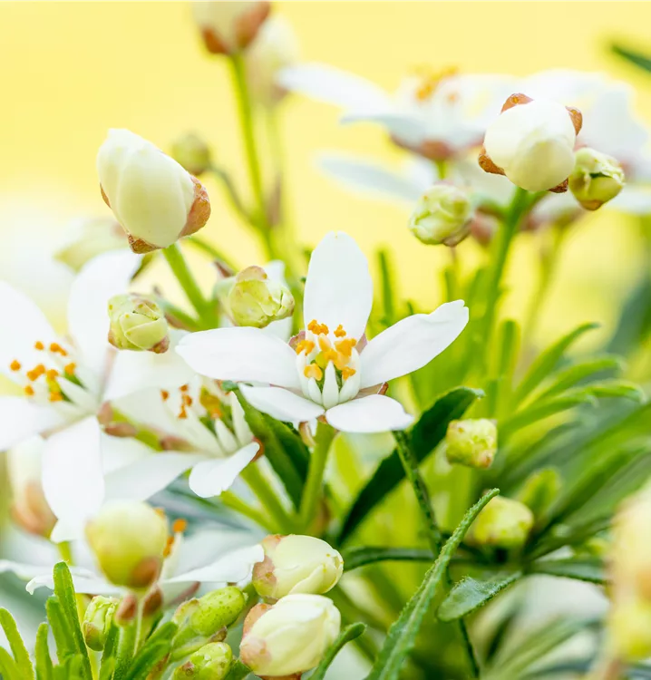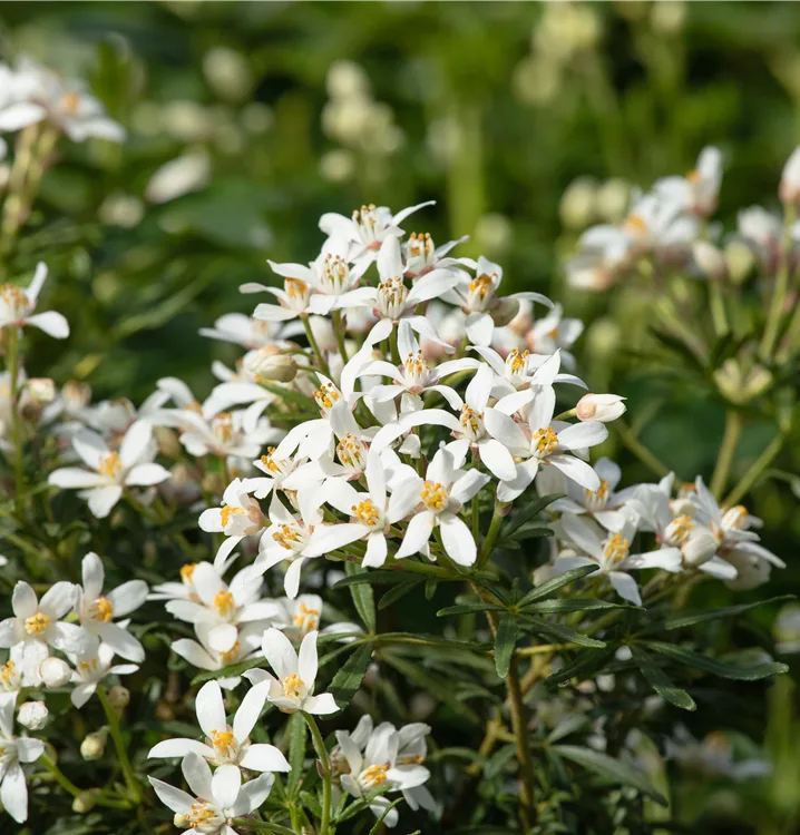 Die Orangenblume 'White Dazzler' (Choisya ternata) ist eine sehr beliebte, immergrüne Kübelpflanze. Ihre weissen Blüten sind sternförmig und erscheinen von März bis Oktober. Sie verströmen einen starken Duft. Die mittelgrünen Blätter sind gefingert und glänzend. Der Standort sollte möglichst sonnig bis schattig sein. Eine durchlässige, humose und nährstoffreiche Erde ist dabei ideal. Bei günstigen Bedingungen erreicht die Orangenblume 'White Dazzler' eine Höhe von ca. 1,5 m und wird bis zu 1,5 m breit.