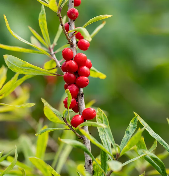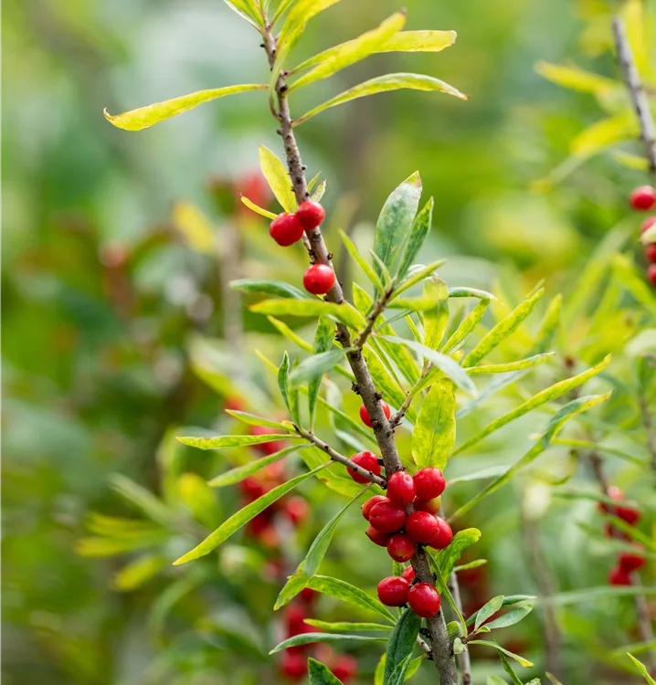 Besonders dekorativ sind die roten Steinfrüchte von Daphne mezereum 'Rubra Select'. Diese erscheinen ab Juni.
