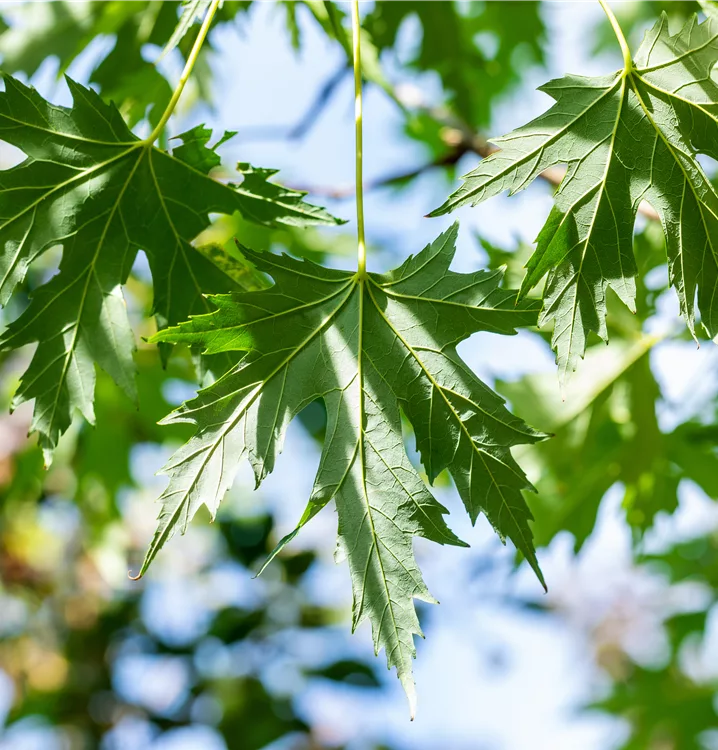Die sommergrünen Blätter des Geschlitzt.Silberahorns 'Laciniatum Wieri' sind hellgrün, glänzend, gelappt. Diese sind etwa 8 - 14 cm gross. Bronzefarbener Austrieb. Geschlitzt.Silberahorn 'Laciniatum Wieri' zeigt sich leuchtend gelb im Herbst.