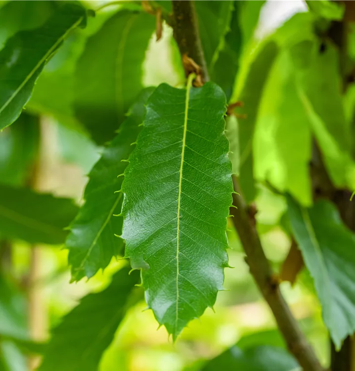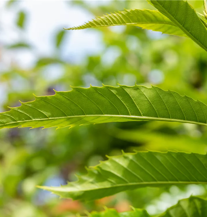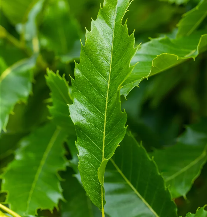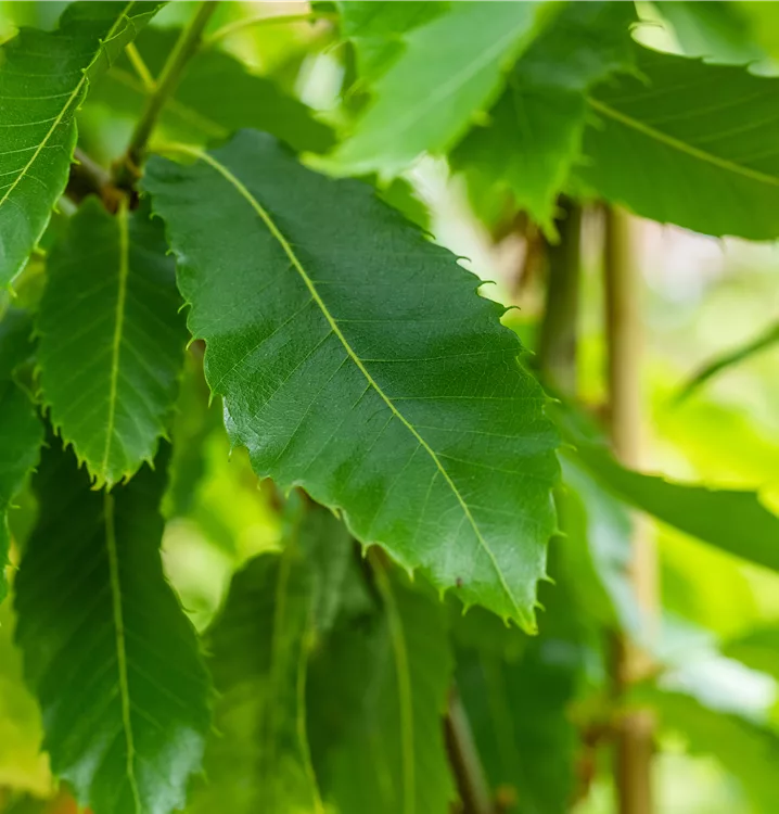 Die sommergrünen Blätter der Esskastanie 'Dorée de Lyon' sind dunkelgrün, lanzettlich, glänzend, wechselständig, gesägt. Esskastanie 'Dorée de Lyon' zeigt sich leuchtend goldgelb im Herbst.