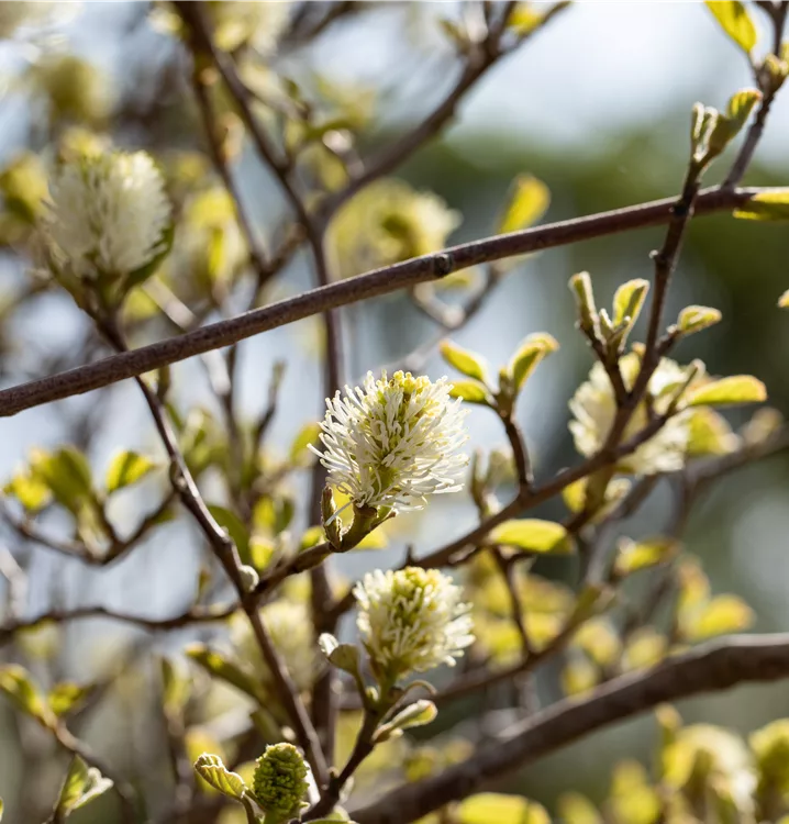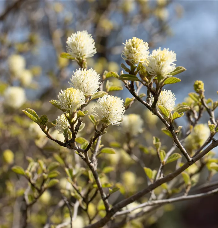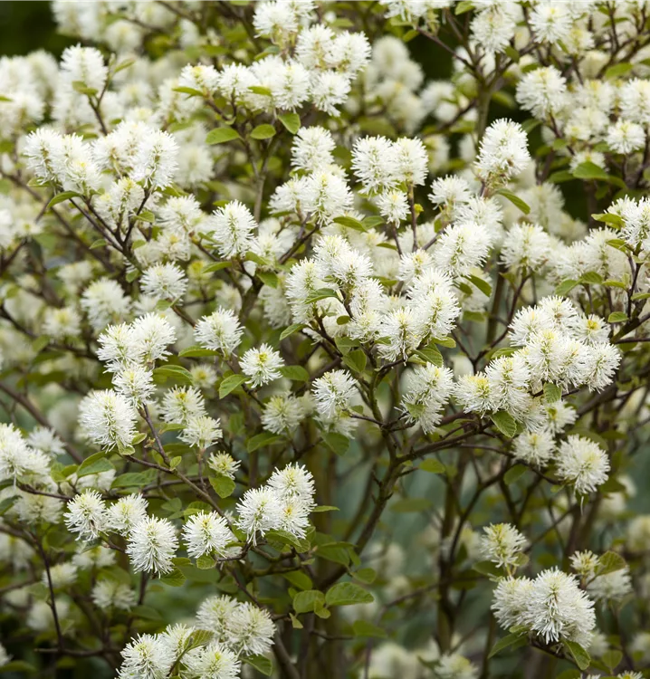 Die cremeweissen Blüten des Zwerg-Federbuschstrauch erscheinen in Ähren von April bis Mai. Diese werden etwa 2 - 4 cm gross und sind stark duftend.
