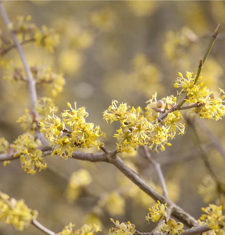 Die Japanische Kornelkirsche (Cornus officinalis) ist ein ausladender, mehrstämmiger Grossstrauch mit dekorativen, scharlachroten, ovalen Früchten. Diese verströmen einen angenehmen Duft. Diesen voraus bringt sie von Februar bis März gelbe Blüten hervor. Zudem trägt die Japanische Kornelkirsche, glänzende, eiförmige, dunkelgrüne Blätter. An einem sonnigen bis halbschattigen Standort mit durchlässigem, humosem, kalkhaltigem Boden erreicht sie gewöhnlich eine Höhe von ca. 7 m und wird ca. 5 m breit.