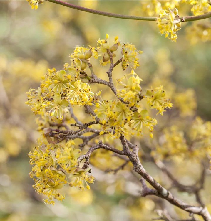 Die gelben Blüten erscheinen von Februar bis März. Diese sind angenehm duftend.