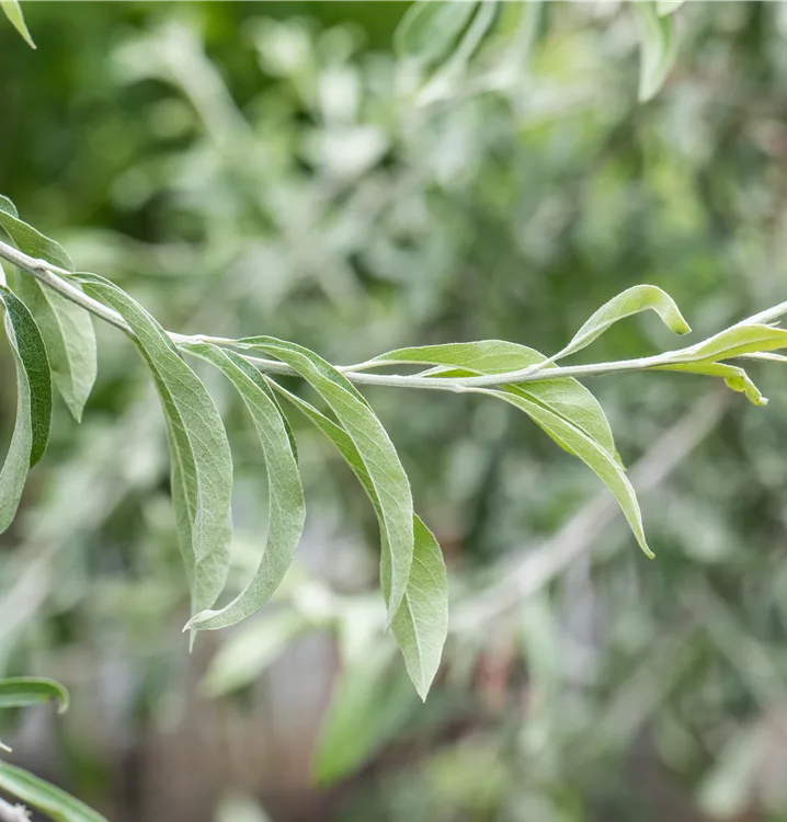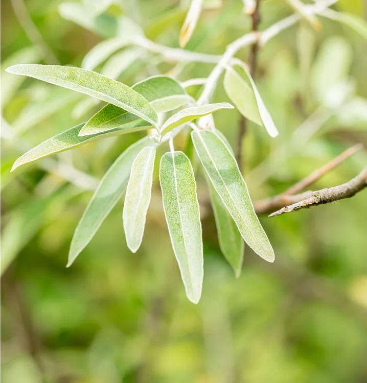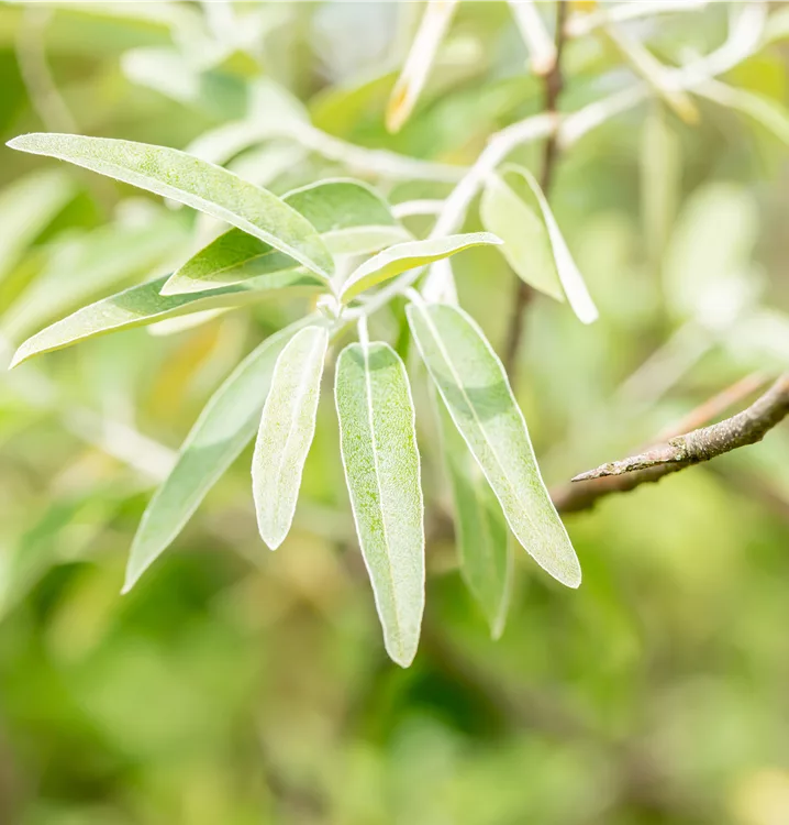 Hoher Blattschmuckwert. Die sommergrünen Blätter der Schmalblättrige Ölweide sind silbrig, lanzettlich, wechselständig. Diese sind etwa 4 - 8 cm gross. Weisser Austrieb.