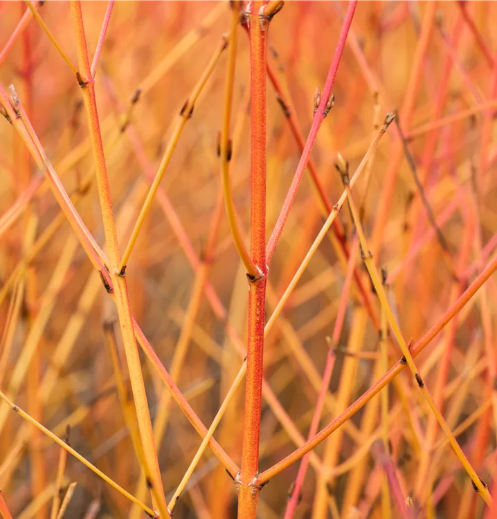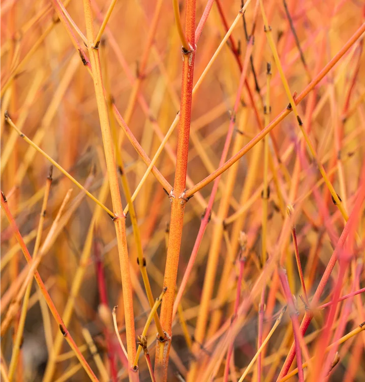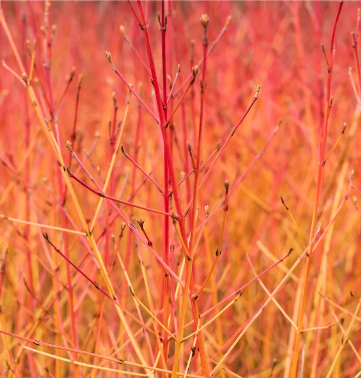 Die Triebe von Cornus sanguinea 'Midwinter Fire' sind rot.