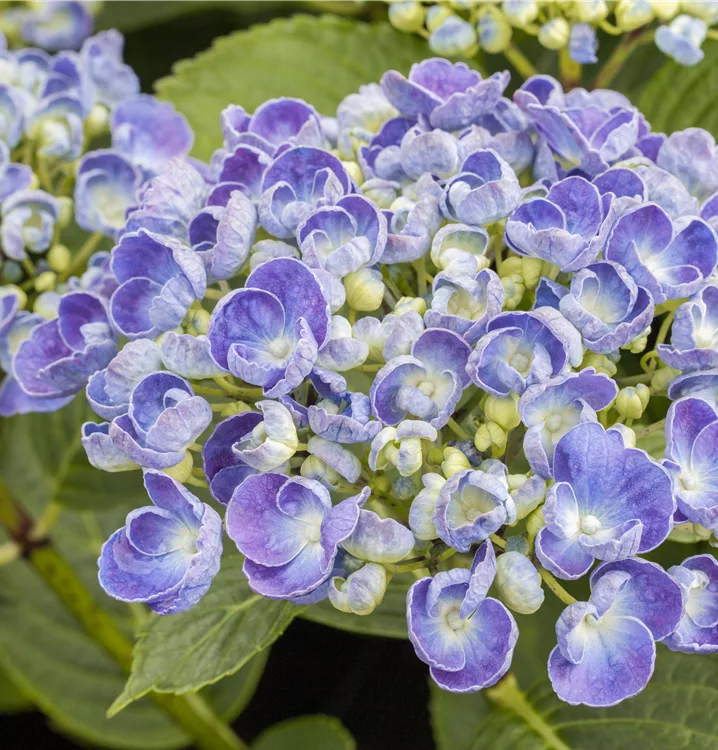 Die blau-weissen, schalenförmigen Blüten der Bauernhortensie 'Ayesha'(s) erscheinen in Dolden von Juni bis Oktober.