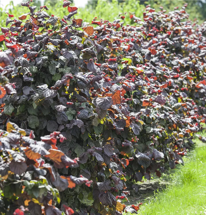 Corylus avellana 'Red Majestic' bildet rot-braune Nüsse mit einem aromatischen, nussigen Geschmack. Reifezeit ab September.