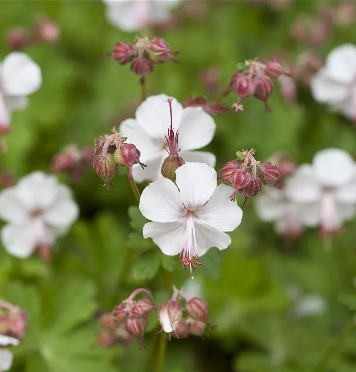 Geranium x cantabrigiense 'Biokovo' bildet hellrosafarbene Blüten ab Mai.
