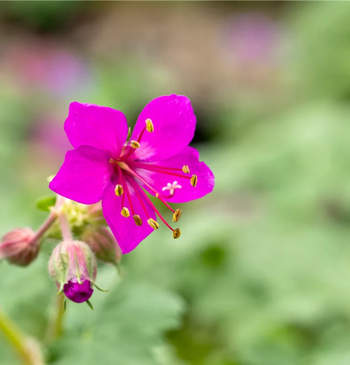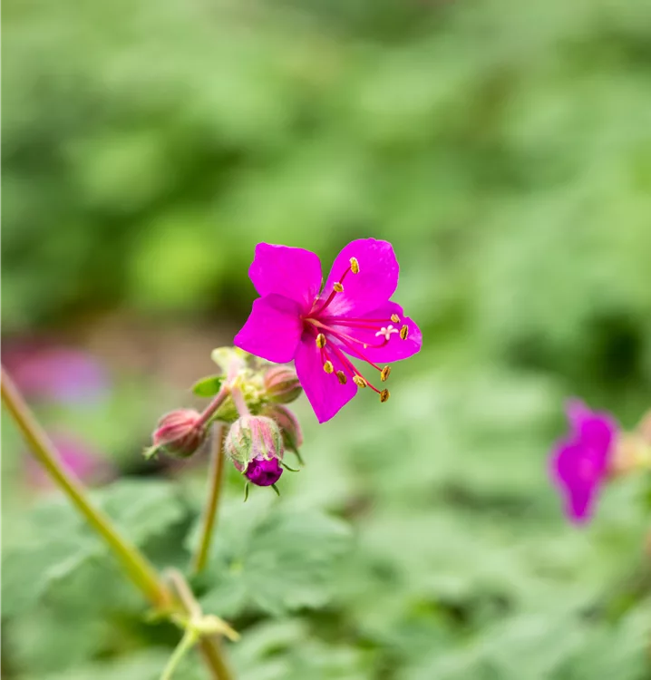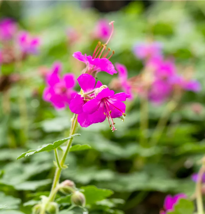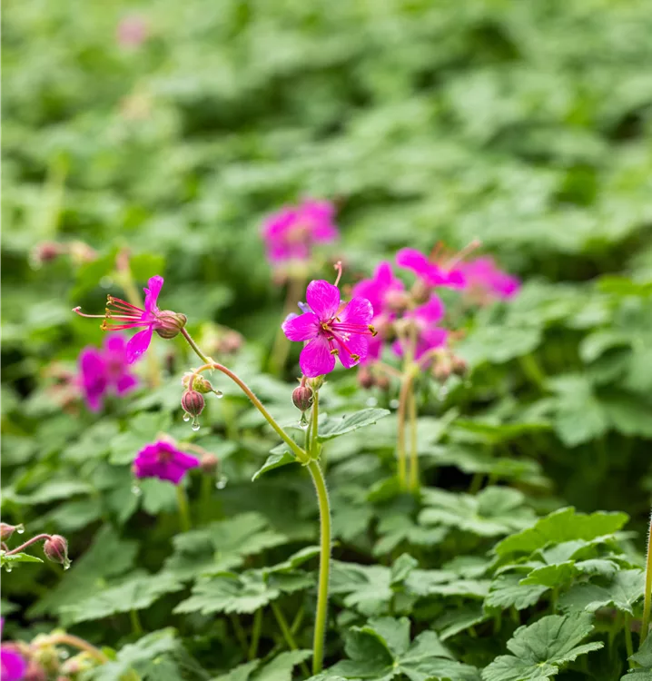 Geranium macrorrhizum 'Czakor' bildet schalenförmige, magentafarbene Blüten ab Mai.