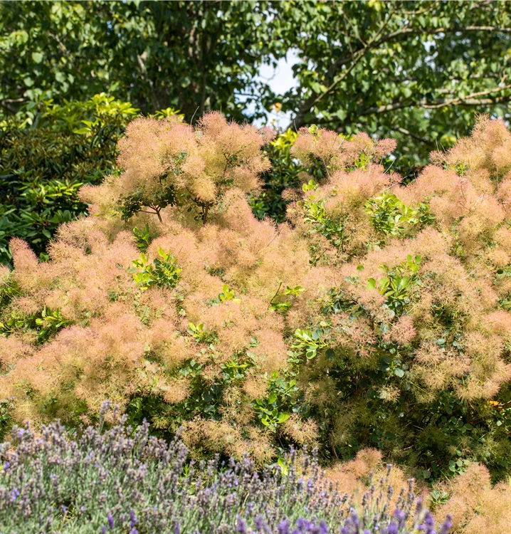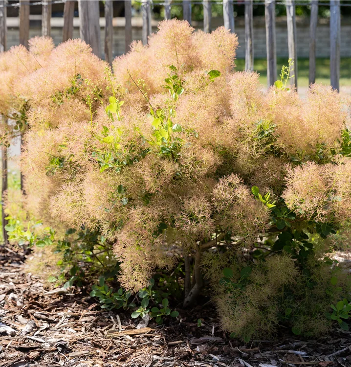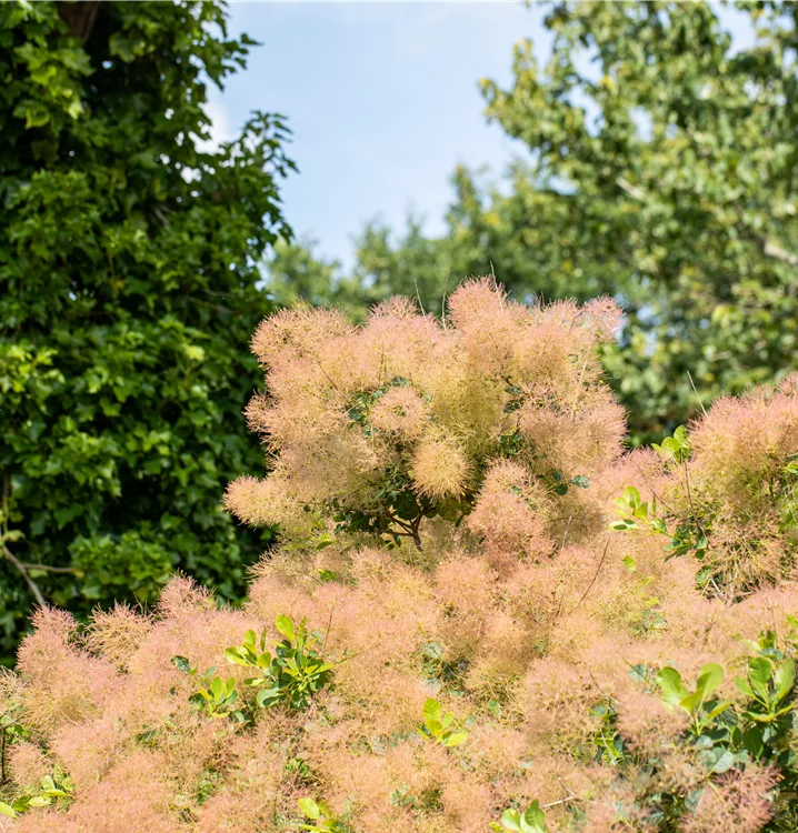 Besonders dekorativ sind die hellbraunen Früchte von Cotinus coggygria. Diese erscheinen ab August.