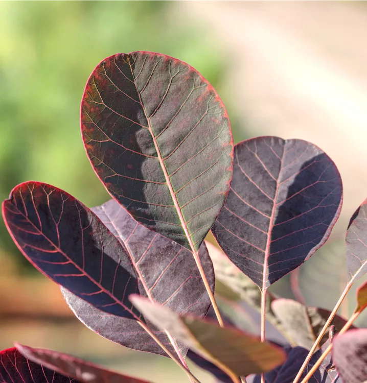 Die sommergrünen Blätter des Perückenstrauchs sind mittelgrün, eiförmig, wechselständig. Diese sind etwa 3 - 8 cm gross. Perückenstrauch zeigt sich leuchtend orangegelb bis scharlachrot im Herbst.