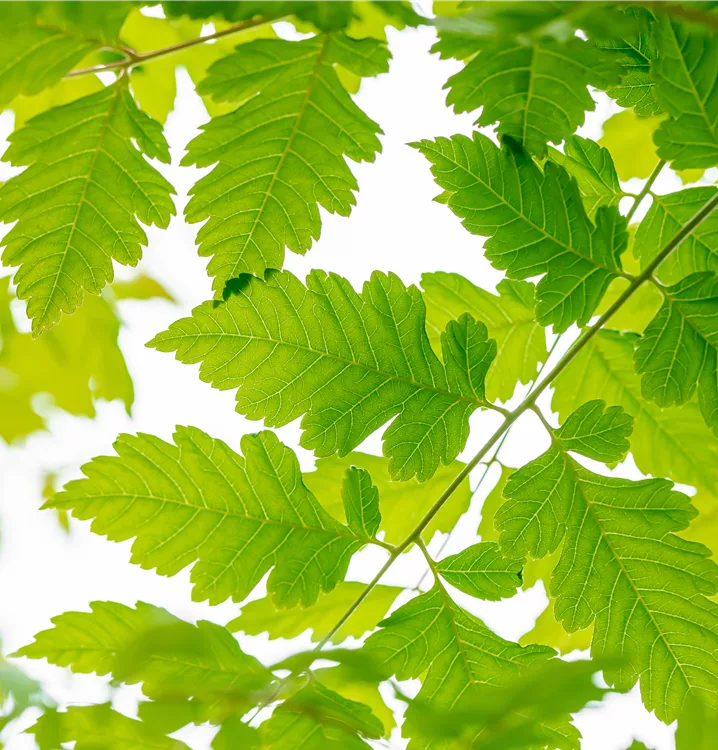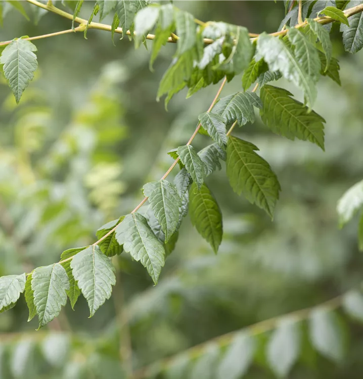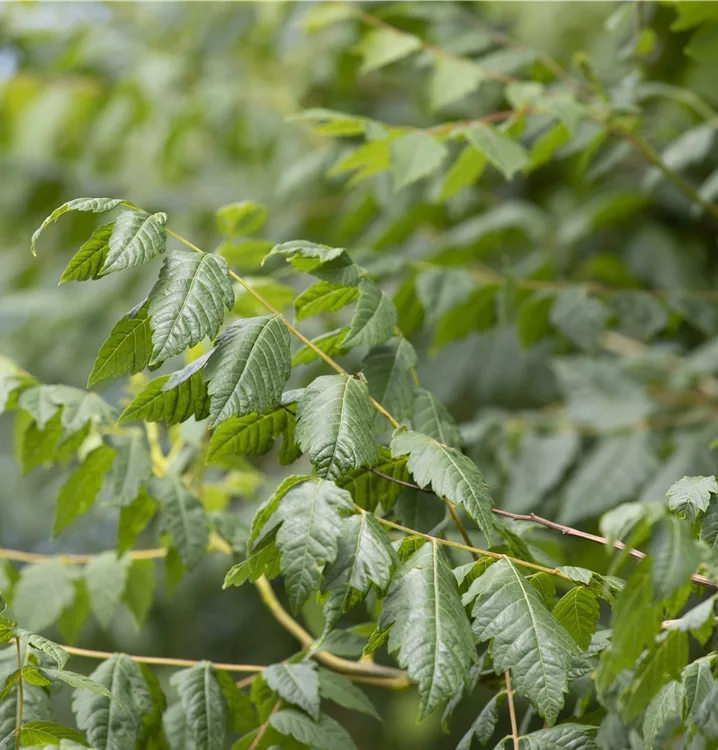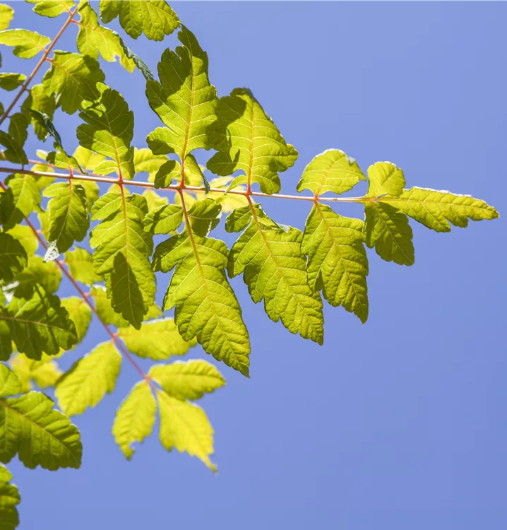 Die sommergrünen Blätter des Blasenbaums 'Coral Sun' sind dunkelgrün, gefiedert, gesägt. Diese sind etwa 20 - 25 cm gross. Roter Austrieb. Blasenbaum 'Coral Sun' zeigt sich leuchtend gelb-orange im Herbst.